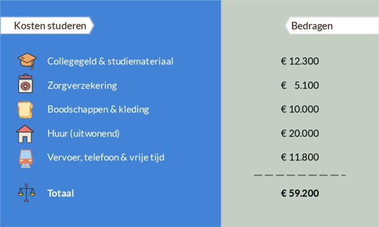 Bij studeren komt meer kijken dan alleen het maandelijkse collegegeld. Ook zaken als boeken, computer, vervoer en telefoon loopt al snel in de papieren.
